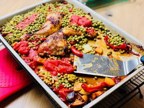 Zutaten: Kartoffeln & Süßkartoffeln (Menge nach Bedarf) 2 Zwiebeln Salz & Pfeffer Oregano Tomatenpaprika aus dem Glas 1 gr. Dose feine Erbsen 1 Dose geschälte Tomaten 4 gewürzte Hähnchenkeulen
