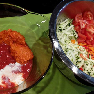 Die Zucchini mit dem Gemüseraspler raspeln, Paprika in feine Streifen schneiden, die Tomaten in Würfel schneiden und die Frühlingszwiebeln in Röllchen schneiden und alles zusammen mit dem Fleisch in einer Schüssel vermischen.