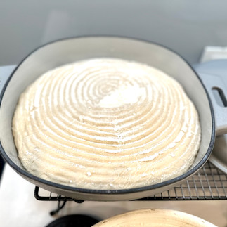 Nach der Ruhezeit den Teigling aus dem Gärkörbchen in die heiße emaillierte Pfanne stürzen - Deckel auflegen und in den Backofen einschieben